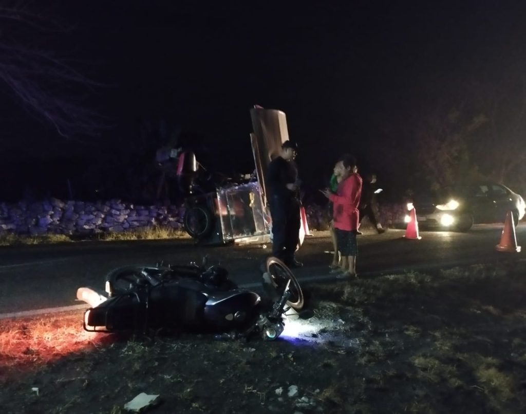 Kinchil, Yuc., a 3 de mayo 2023.- Una pareja de adultos que iba a bordo de un tricimoto acabaron policontundidos luego de ser impactados por un motociclista alcoholizado, la noche de ayer en el tramo Kinchil-Tetiz.