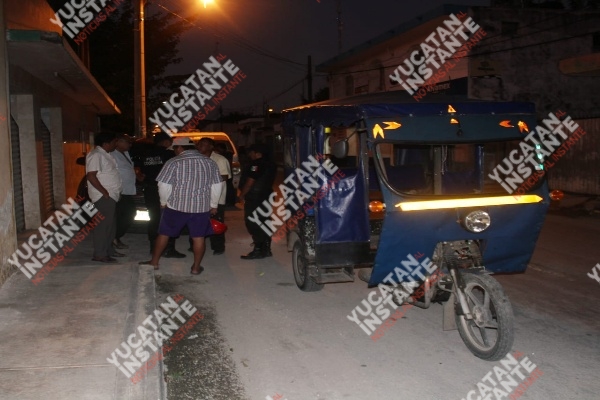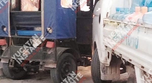 Kinchil, Yuc., 17 de noviembre de 2019.- Un ebrio a bordo de un mototaxi acabó enganchado en un camión repartidor de agua purificada en la calle 20 por 23 y 25 de Kinchil.