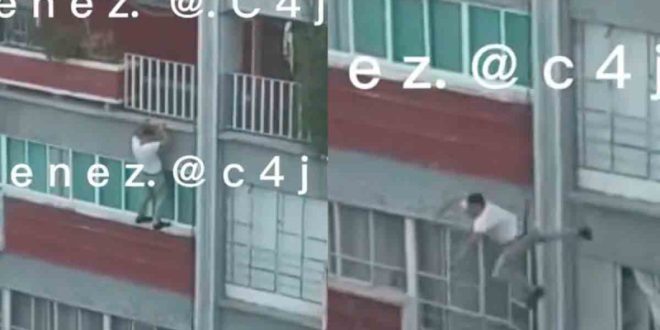 En redes sociales comenzó a circular un video en el que se observa al hombre caminando por fuera de uno de los departamentos, mientras intenta sostenerse de los marcos de las ventanas, sin embargo, no lo logra y termina por caer al vacío.