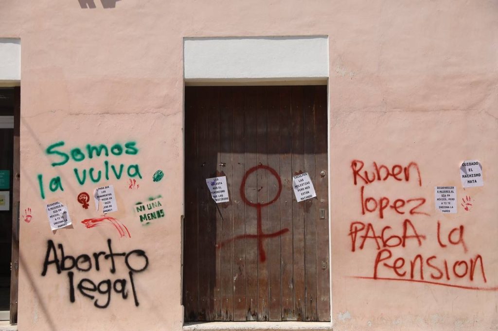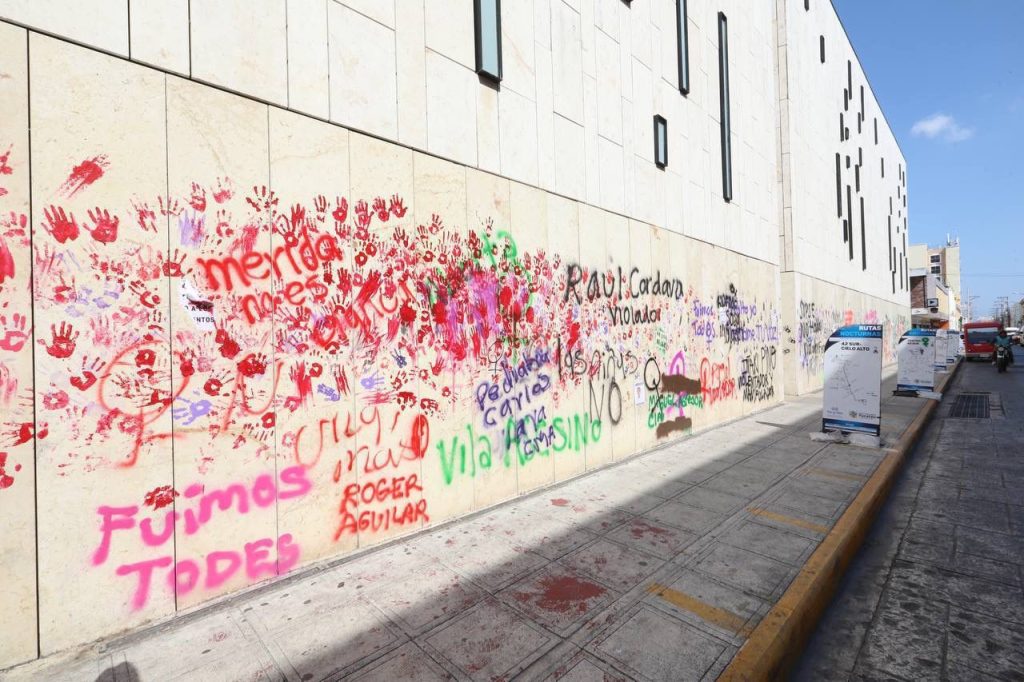 Mérida, Yucatán, 9 de marzo de 2023.- Hoy los edificios emblemáticos y algunos inmuebles particulares de la ciudad amanecieron llenos de pintas, carteles pegados y otras afectaciones, luego de la marcha de la conmemoración del Día Internacional de la Mujer.