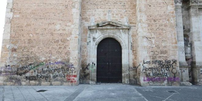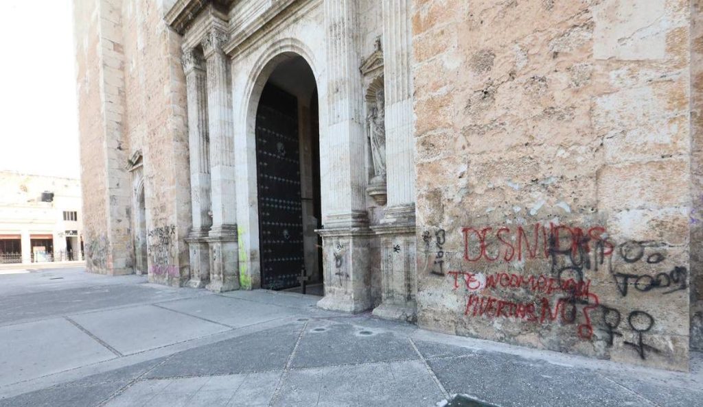 Entre los sitios que se vieron afectados se encuentra la Catedral de Mérida, sitio histórico de más de 400 años de antigüedad, el cual la noche de ayer fue pintado por manifestantes encapuchadas que dejaron plasmadas consignas y símbolos feministas.
