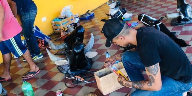 Hace aproximadamente 15 días varios de los jóvenes empezaron con la elaboración de los adornos hechos con fibra de vidrio. Las labores se dividieron entre cortar, lijar, moldear y pintar cada uno de ellos. En su momento, Carlos, Brayan, Jesús y otros jóvenes de este Centro no tenían el conocimiento de cómo trabajar con la fibra de vidrio. Sin embargo, en esta misma Casa Hogar se les ha ido enseñando poco a poco para lograr el acabado que se requiere para los toros, caballos, mestizos y hasta un torero que estará en los bajos del Palacio Municipal una vez que inicien las fiestas en honor a la Virgen de la Candelaria.