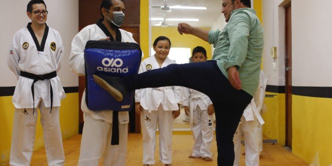 El munícipe fue invitado a dar unas patadas punch y también a practicar con los pequeños.