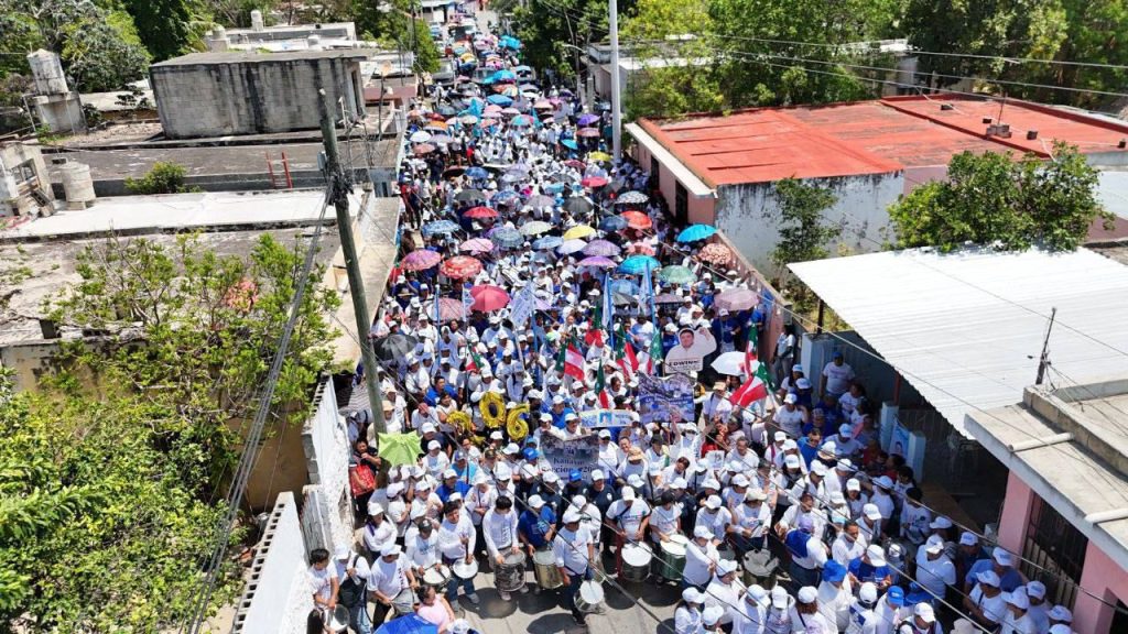 Decenas de vecinos del centro de Kanasín, a pesar de las altas temperaturas, se sumaron a la caminata de este domingo al ritmo de batucada y de porras, pancartas, globos y de gritos de apoyo.