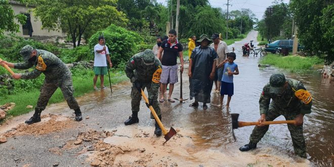Valladolid, Yucatán a 5 de junio de 2020.- La Secretaría de la Defensa Nacional, a través de la X Región Militar y la 32/a. Zona Militar, informa a la ciudadanía que, con motivo de los efectos ocasionados por la Tormenta Tropical Cristóbal, tropas del Ejército mexicano continúan aplicando el Plan DN-III-E en auxilio de la población civil.
