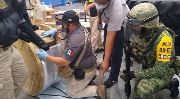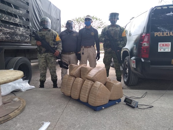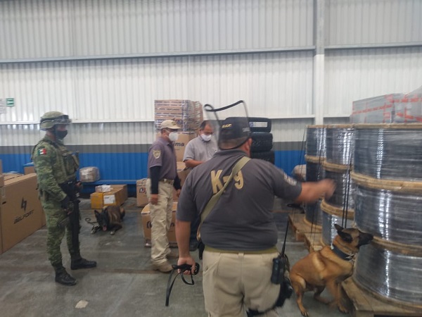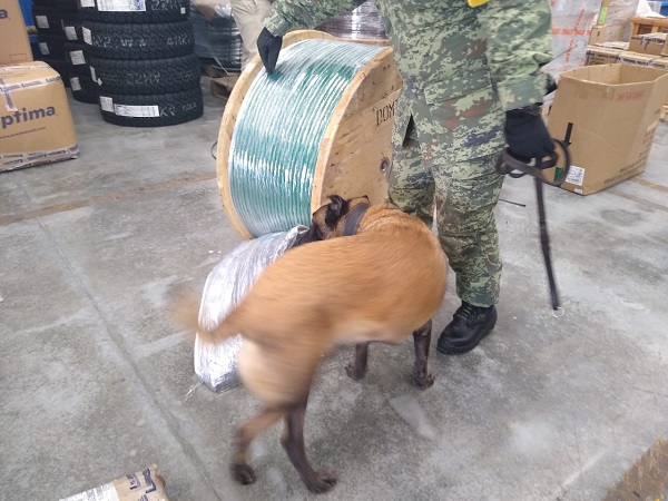 Mérida, Yucatán a 8 de agosto de 2020.- La Secretaría de la Defensa Nacional, a través de la X Región Militar y 32/a. Zona Militar, informan a la ciudadanía que en el marco del Plan Nacional de Paz y Seguridad 2018-2024, y para contribuir a la Estrategia Nacional de Prevención de Adicciones “Juntos por la Paz”, como parte de las revisiones periódicas que se realizan en las diferentes empresas de paquetería, esta fecha, tropas jurisdiccionadas a este Mando Territorial, en coordinación con la Secretaría de Seguridad Pública del Estado de Yucatán, al efectuar una inspección de paquetería con apoyo de un can perteneciente al 11/o. B.I. y un can de la S.S.P., aseguraron lo siguiente: 500 kilogramos aproximadamente de hierba seca con características propias a la marihuana, ocultas en 9 carretes de manguera emplayados con material plástico.