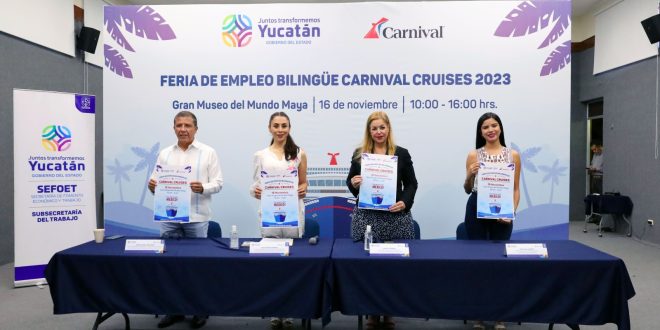 Mérida, Yucatán, 8 de noviembre de 2023.- El jueves 16 de noviembre se llevará a cabo la Feria de Empleo Bilingüe de Carnival Cruise de 10:00 a 16:00 horas en el Gran Museo del Mundo Maya, para acercar nuevas oportunidades de desarrollo profesional a las y los yucatecos en el sector turístico y de la hospitalidad.