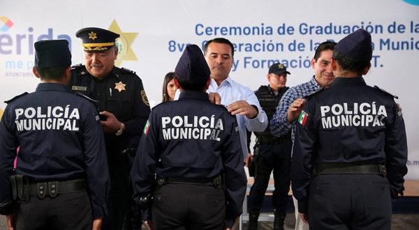 El alcalde Renán Barrera Concha afirmó que Mérida seguirá siendo ejemplo de seguridad y para ello el Ayuntamiento reforzará el apoyo a la Policía Municipal con mejores condiciones laborales y prestaciones que permitan garantizar una mejor vida para los agentes y sus familias.