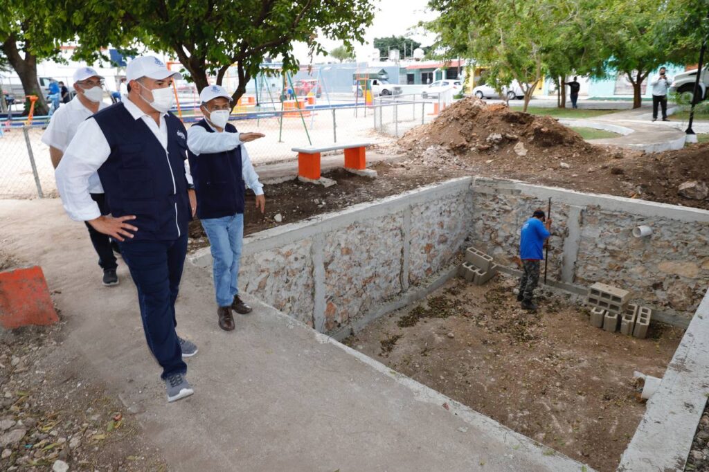 Acompañado de los directores de Servicios Públicos Municipales y Obras Públicas, José Collado Soberanis y David Loría Magdub, respectivamente, el Primer Edil visitó la colonia Ricardo Flores Magón, donde supervisó acciones de mantenimiento integral al parque Vergel 1, así como la construcción y mantenimiento de un aljibe, brocales y pozos con una inversión de 452 mil pesos.