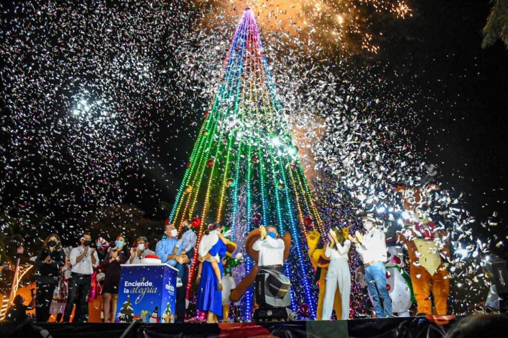 Cabe recordar que el árbol navideño cuenta con más de 7,000 luces multicolor de Led con efectos luminosos, asimismo se encuentran figuras luminosas en 3D, como un túnel, esferas navideñas, el trineo de Santa Claus y un nacimiento completo, además una cortina de luces destellantes en la entrada.