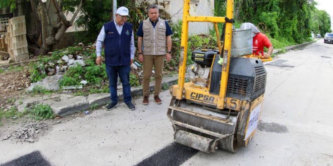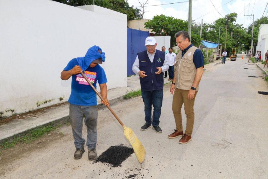 El Alcalde Alejandro Ruz Castro supervisa los trabajos de bacheo en la comisaría de Cholul.