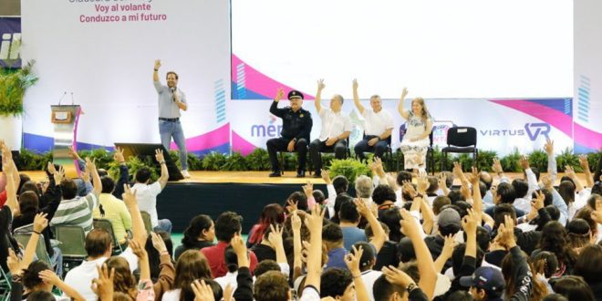 Mérida, Yucatán 1 diciembre de 2023-. Ante 2,500 estudiantes y representantes de diversas escuelas del municipio, el Alcalde Alejandro Ruz Castro encabezó la clausura del programa “Voy al Volante, Conduzco a mi Futuro”, que durante más de dos meses llevó platicas y actividades de prevención del consumo de drogas y de alcohol a 12 mil alumnas y alumnos de 25 universidades y preparatorias de Mérida.