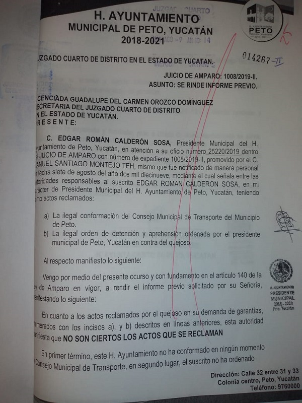 El 23 de julio le hicimos llegar nuestra solicitud del amparo al juez federal, y días posteriores informamos a la sociedad de la situación de amparo en que nos encontramos, y luego recibimos documentos oficiales fechados del 7 de agosto por el juez del Distrito en el Estado de Yucatán, en donde concede la suspensión provisional solicitada “…para que el efecto de que el quejoso no sea detenido o aprehendido, hasta que se dicte en estos autos incidentales la resolución correspondiente a la suspensión definitiva del acto reclamado; claro está, bajo las medidas de aseguramiento que este órgano de control constitucional estime necesarias a fin de que no se evada de la acción de la justicia”, asimismo, giró indicaciones oficiales: “solicítese a las autoridades responsables sus respectivos informes previos, al que deberán rendir por duplicado, dentro del plazo de cuarenta y ocho horas siguientes a la notificación de este acuerdo, de conformidad con lo dispuesto en el diverso numeral 138, fracción 111 de la Ley de Amparo; apercibidas las autoridades administrativas responsables que de no cumplir con lo anterior, al resolver el fondo del asunto se les impondrá a cada uno una multa por el equivalente a cien mil valores diarios de la Unidad de Medida y Actualización”