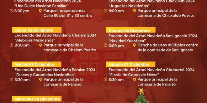 Y el sábado 7, el puerto de Chuburná encenderá el arbolito con la temática “Fiesta de copos de nieve” a las 6:30 de la tarde en la cancha de usos múltiples.