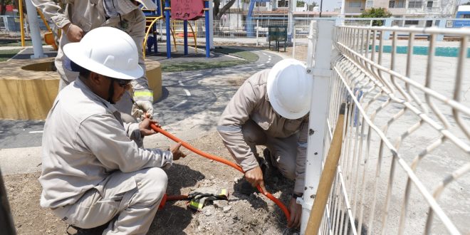 Este lunes las cuadrillas realizaron trabajos en los parques de las colonias Bojórquez y Esperanza, así como en el fraccionamiento Lindavista II, donde se ejecutaron trabajos de reconexión de líneas, reparación de tuberías y de registros existentes.