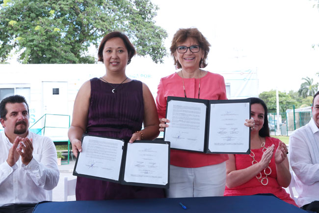 La alcaldesa, María Fritz Sierra, firmó esta mañana un convenio con la Fundación “Construyendo a México Crecemos”, gracias al cual vecinos del sur meridano y trabajadores del Ayuntamiento podrán asistir a diferentes cursos en dos aulas móviles que se instalarán en el Centro Cultural del Sur y el Centro Integral del Sur.