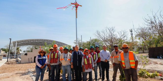 Tal como marca la tradición, junto con el grupo de trabajadores, participó en la colocación de una cruz adornada con flores naturales y listones en conmemoración de este día y posteriormente compartió el desayuno con los alarifes.