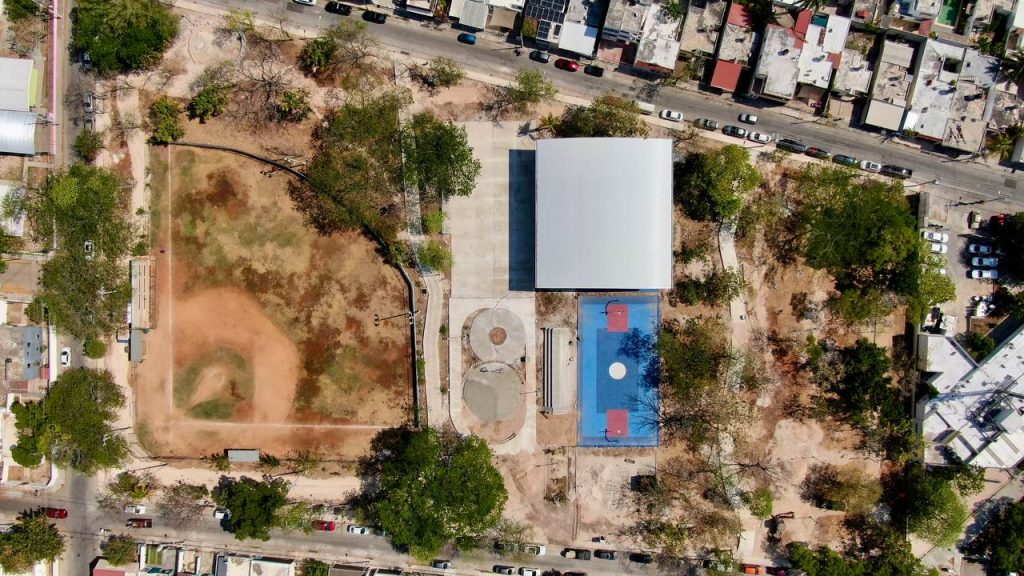 “La obra consiste en la rehabilitación de las canchas de usos múltiples de básquetbol y fútbol, así como la rehabilitación del área infantil del parque”, señaló.