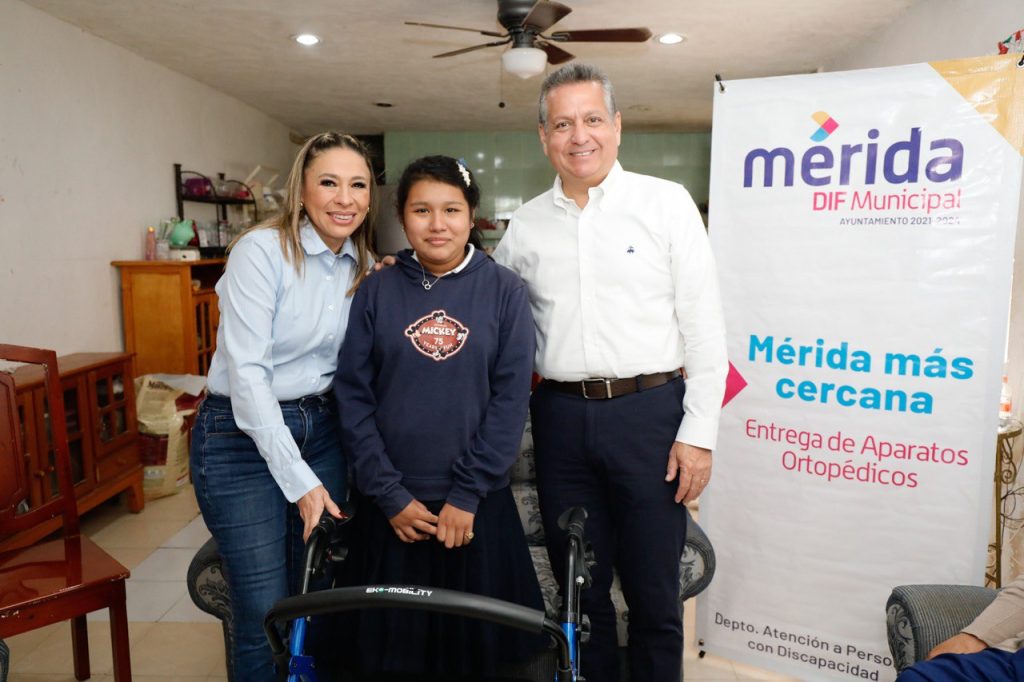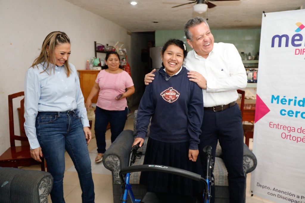 En el marco de ese programa, el Alcalde y su esposa, Verónica Cetina Arjona, presidenta del DIF Mérida, acudieron a la casa de Gabriela García Gómez, en la colonia Amapolita, para entregarle un asiento “Rollator” con ruedas para la niña Emma de 12 años de edad, para que tenga una movilidad más segura y mejorar su calidad de vida.