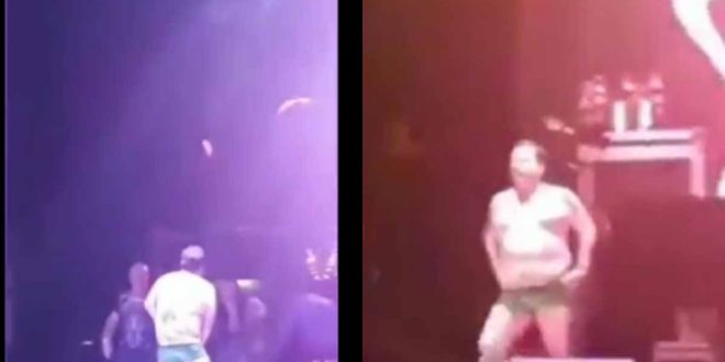 Un hombre del staff llega corriendo y trata de subirle la ropa interior, mientras ‘El Borrego’ continúa moviéndose.
