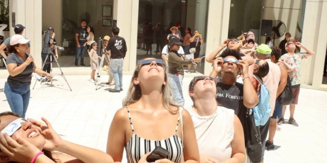 Mérida, Yucatán, 8 de abril de 2024: Bajo las medidas oficiales de protección ocular proporcionadas por el Ayuntamiento de Mérida, decenas de personas, tanto locales como turistas nacionales y extranjeros, disfrutaron del eclipse parcial que se observó este lunes 8 de abril.