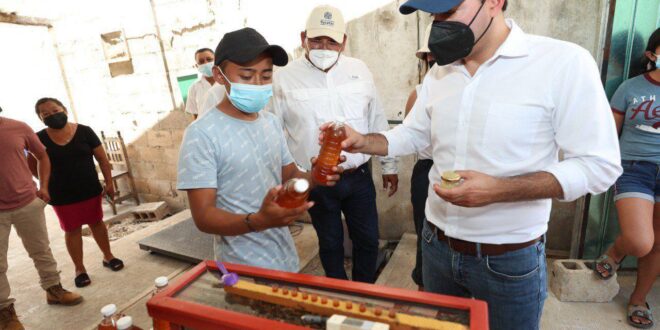 Vila Dosal visitó el hogar del joven emprendedor, donde junto a su padre Alberto Parra Chan y su hermano José Alberto Parra Koh se han dedicado a esta actividad durante años, siendo Jhonny el único que ha demostrado un interés por conocer e investigar diferentes maneras de usar a las abejas para curar la salud de las personas.