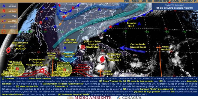 Esta mañana, se presentan condiciones de cielo mayormente nublado con nubosidad de desarrollo convectivo en el centro y noroeste de la península de Yucatán asociadas a los remanentes de “Gamma”, presentándose en este momento intervalos de chubascos acompañados de descargas eléctricas. Por otro lado, el Huracán Cat.2 “DELTA” se localiza a 675 km al ESE de Cozumel, Q.Roo, presenta vientos máximos sostenidos de 155 km/h y rachas superiores, con un desplazamiento al WNW a 24 km/h, se estará aproximando al noreste de la península de Yucatán durante la madrugada hacia el amanecer del miércoles.