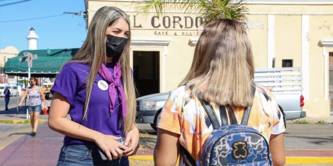 Progreso, Yucatán a 14 de enero de 2022. En una estrategia más por promover la red de servicios que brinda la Secretaría de las Mujeres (SEMUJERES) y el Instituto Municipal de la Mujer (IMM), esta mañana ambas instancias coordinaron el “Volanteo Violeta” en el primer cuadro de la ciudad a fin de que progreseñas identifiquen las atenciones psicológicas, jurídicas y de trabajo social que hay en el municipio a favor de una vida libre de violencia y no discriminación.