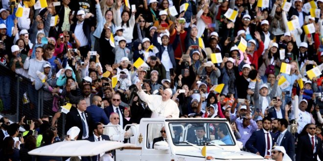 El papa Francisco llegó este martes al estadio de la Ciudad Deportiva Zayed de Abu Dabi donde celebró una misa ante miles de fieles, en el último día de su histórica visita a los Emiratos Árabes Unidos.