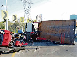 En la curva más cerrada el peso de los montacargas y la velocidad se conjugaron para propiciar que el camión se volcara sobre su izquierda.