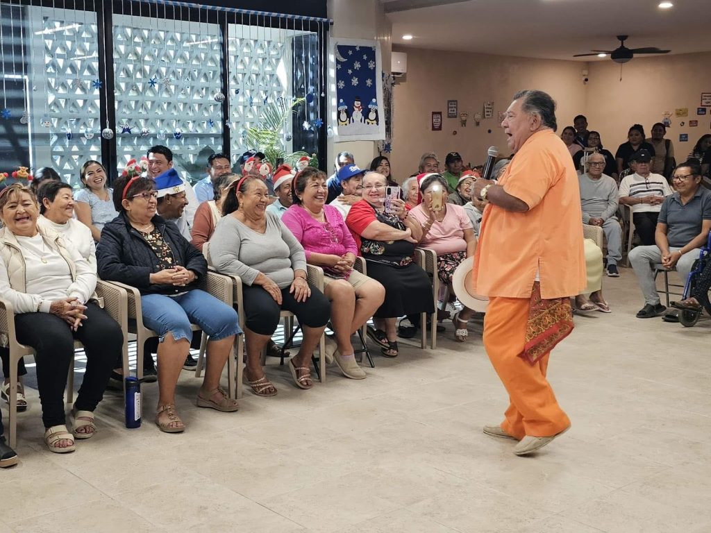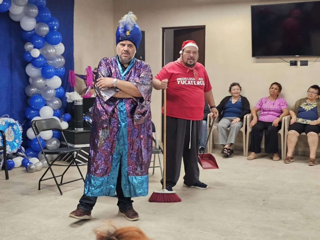 Kanasín, Yucatán a 28 de diciembre 2024.- El Teatro Regional se trasladó ayer viernes a la Casa del Adulto Mayor “Amanecer Pilar de Luz” cuando más de 50 abuelitos disfrutaron de las ocurrencias de Dzereco y Nohoch, así como también de Mario III, padre de los cómicos regionales.