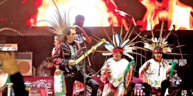 Pero antes de rockear, un ritual con danzantes aztecas para pedir permiso a los dioses del Universo, santificó el escenario y Lora, de 70 años, apareció corriendo, de un costado a otro, con su guitarra.