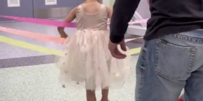 En las imágenes se observa a una menor de edad siendo cargada por un hombre. La niña lleva puesto un vestido con brillos en la parte de arriba mientras avanza por el pasillo hasta llegar al fondo en donde ya la esperan otras personas, además de una botarga de dinosaurio.