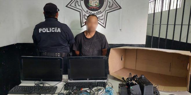 KANASÍN, Yuc., 03 de febrero 2023.- Elementos de la Policía Municipal de Kanasín detuvieron a Mario Alberto V.G., de 36 años de edad y oriundo de Tabasco, por sustraer equipos y accesorios de cómputo de unas oficinas en el kilómetro 2.5 de la carretera a Tixkokob.