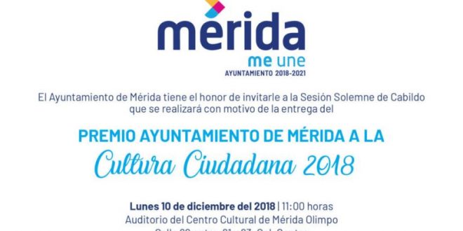 Para reconocer a aquellos ciudadanos que se han distinguido por preservar y difundir los valores y tradiciones de nuestro municipio, el Ayuntamiento de Mérida entregará este lunes 10 de diciembre los Premios a la Cultura Ciudadana 2018, en Sesión Solemne de Cabildo en el Auditorio del Centro Cultural de Mérida Olimpo a las 11:00 horas.
