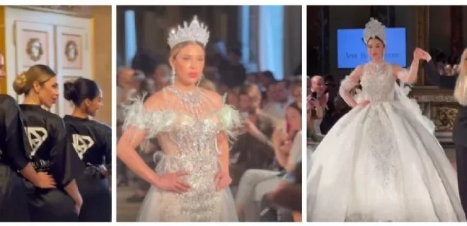 En las grabaciones no podía faltar el momento del debut de la esposa del ‘Chapo’ en el Milan Fashion Week, donde desfiló con un brillante vestido confeccionado con lentejuelas, plumas, sedas y tul; mientras que su accesorio principal fue una corona alta, que recuerda a la vez en la que fue reina de belleza en una fiesta local de Durango, donde residió durante varios años.