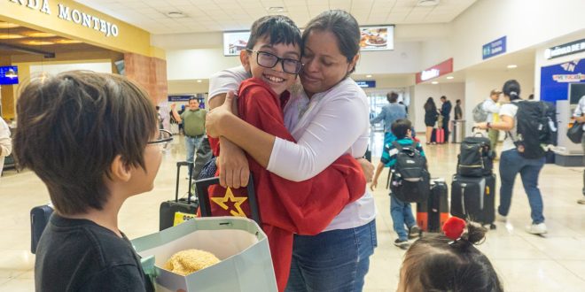 Mérida, Yucatán, a 2 de agosto de 2024.- Los estudiantes Víctor Gerardo Vázquez Basto y José Antonio Bernal Massa, de sexto grado de Primaria, quienes obtuvieron Mención Honorífica en su participación en la Competencia Internacional de Matemáticas en Lucknow, India, arribaron a Mérida, en medio de felicitaciones de autoridades, maestros y familiares.