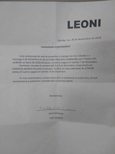 La empresa Leoni encargada en producción de arneses electrónicos y cables para la industria automotriz de Estados Unidos, en días pasados giró un comunicado para los empleados donde manifiesta lo siguiente; que de trabajar el día 1 y 2 (sábado y domingo) de diciembre recibirán un bono de $250, que se entregaría el 7 del mismo mes, así mismo si lograban tener una asistencia perfecta toda la semana del 3 al 8 (lunes a sábado) de diciembre, recibirán un bono de $750 que se entregaría el 14 del mismo mes, el documento contaba con la firma del gerente, según los trabajadores.