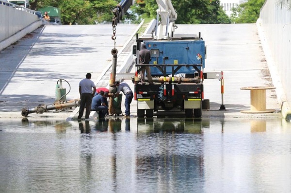 En el lugar, a partir de esta semana labora personal municipal que realiza los trabajos para renovar y dejar en mejor condición el sistema de descarga de aguas, con las bombas reparadas y otras nuevas que permitirán una solución temporal al problema que registra el paso a desnivel.