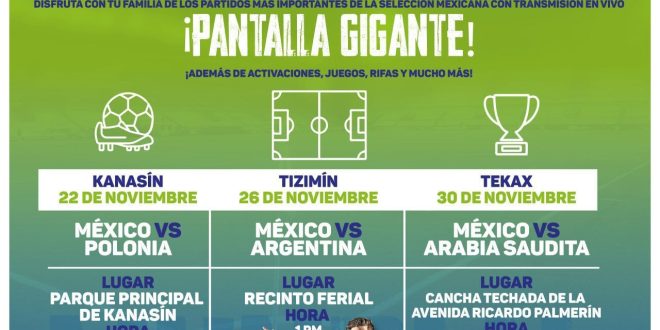 La transmisión de los partidos será de la siguiente forma: el 22 de noviembre, el encuentro México vs Polonia a las 10 de la mañana en la plaza principal del municipio de Kanasín; el 26 noviembre, en Tizimín, se proyectará a la 1 de la tarde el encuentro México vs Argentina en las instalaciones del recinto ferial; en Tekax, el 30 de noviembre a la 1 de la tarde podrán disfrutar de la justa México vs Arabia Saudita en la cancha techada de la avenida Ricardo Palmerín, en el que los aficionados al fútbol vivirán la máxima celebración de este deporte.