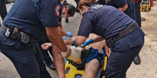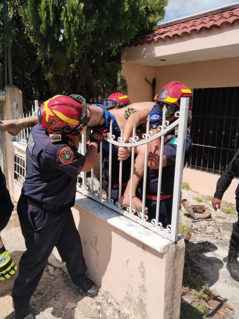 Kanasín, Yuc., 01 septiembre 2024.- Elementos del Cuerpo de Bomberos y de la Policía de Kanasín auxiliaron a una persona del sexo masculino que, alcoholizado, intentó brincar una reja y, al hacerlo, una varilla se ensartó en su pierna derecha.