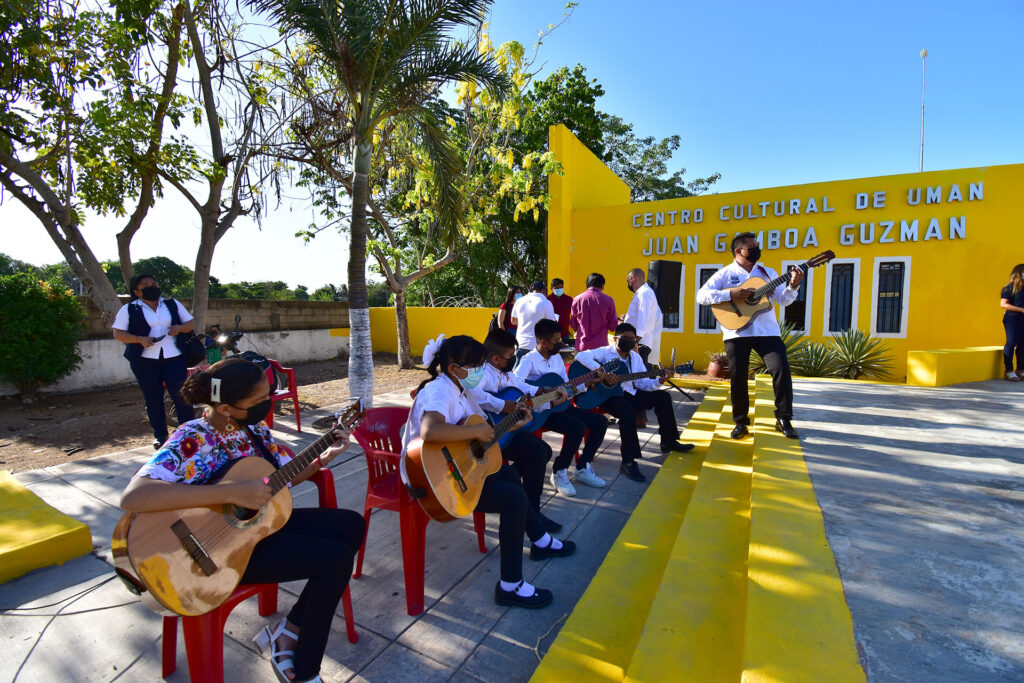 Umán, Yucatán, 17 de mayo de 2022.- Acordes de las guitarras que, recientemente, la Secretaría de la Cultura y las Artes (Sedeculta) entregó al municipio de Umán, se escucharon a la entrada de la Casa de la Cultura “Juan García Ponce”, en la muestra de los avances de niñas y niños del taller de trova, que ahora, se reforzó con equipo e instrumentos por parte del Gobierno que encabeza Mauricio Vila Dosal.