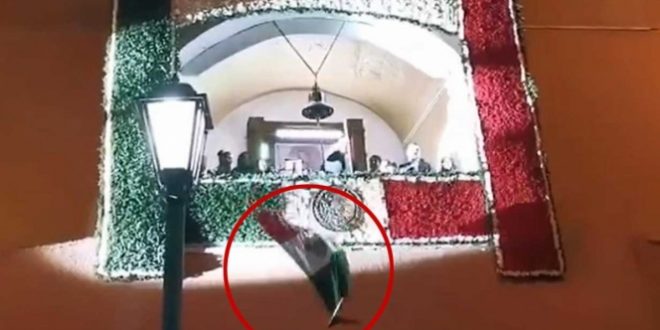 El presidente municipal de Mineral del Monte, Jaime Soto Jarillo, soltó por accidente la asta bandera; asistente al festejo patrio graban el momento