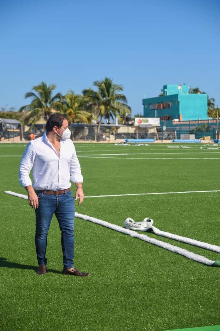 Para tal fin, el edil estuvo acompañado del director de Desarrollo Urbano y Obra Pública, Luis Castro Naal así como representantes de SEDATU, quienes le indicaron que a temprana hora, un grupo de trabajadores, de los 48 que labora en la construcción, se encontraban instalando el pasto sintético.