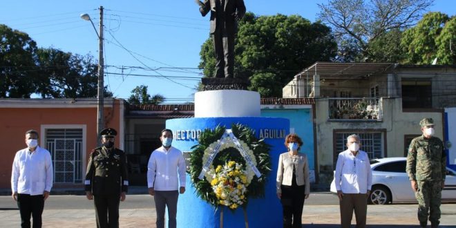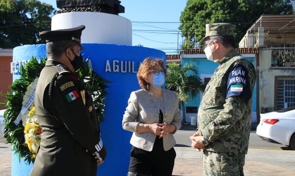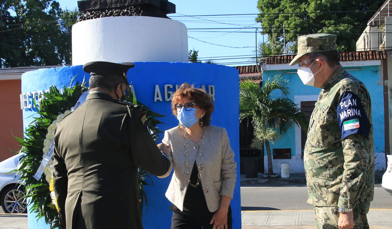 En la ceremonia, la funcionaria, acompañada de autoridades civiles y militares, depositó una ofrenda floral y rindió guardia de honor ante la efigie del legislador yucateco Héctor Victoria Aguilar, a quien se le atribuye la redacción de buena parte del Título Sexto de la Carta Magna, máxima expresión de soberanía nacional y norma suprema del orden jurídico que se encarga de garantizar los derechos de igualdad, libertad y justicia.