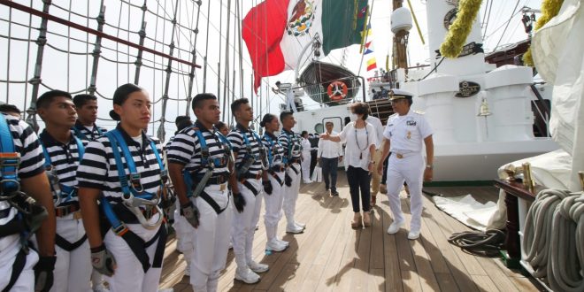 Acompañada de autoridades militares, navales y portuarias, la funcionaria deseó buen mar y mejores vientos a la tripulación; después, cadetes y oficiales demostraron tanto su valentía como formación desde las alturas, a través de diversas maniobras marinas, ejecutadas en palos y perchas del navío.