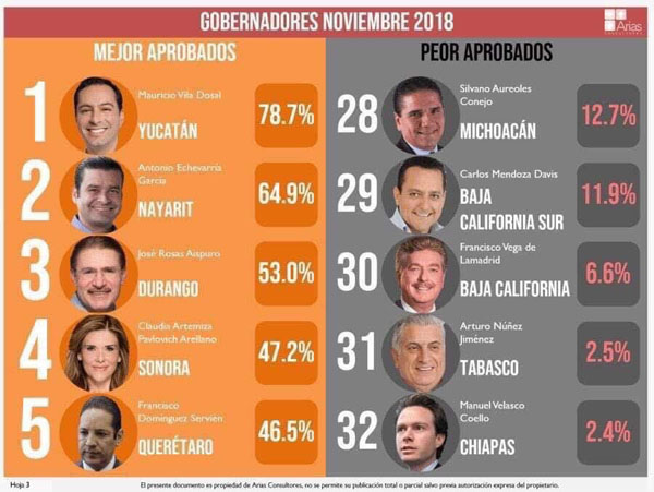 Vila se colocó en el primer sitio con 78.7% de aprobación, por lo que se refiere que casi el 80% de los yucatecos están contentos con el desempeño mostrado por el mandatario estatal en estos casi dos meses de gestión.