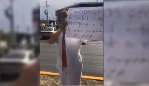 La enfermera estaba con su uniforme, con cubrebocas, unas gafas y se puso frente a un establecimiento que vende cerveza para mostrar su indignación.