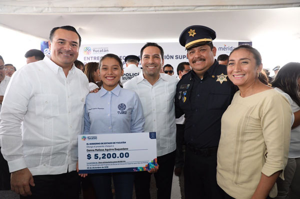 En el marco de las actividades por el Día del Policía, que se conmemora este domingo, Vila Dosal y el alcalde de Mérida, Renán Barrera Concha, entregaron los primeros 43 apoyos económicos para igual número de jóvenes cuyos padres y madres son elementos operativos de la corporación municipal, los cuales se suman a los más 360 hijos de efectivos de la Secretaría de Seguridad Pública (SSP), quienes ya recibieron esta ayuda.