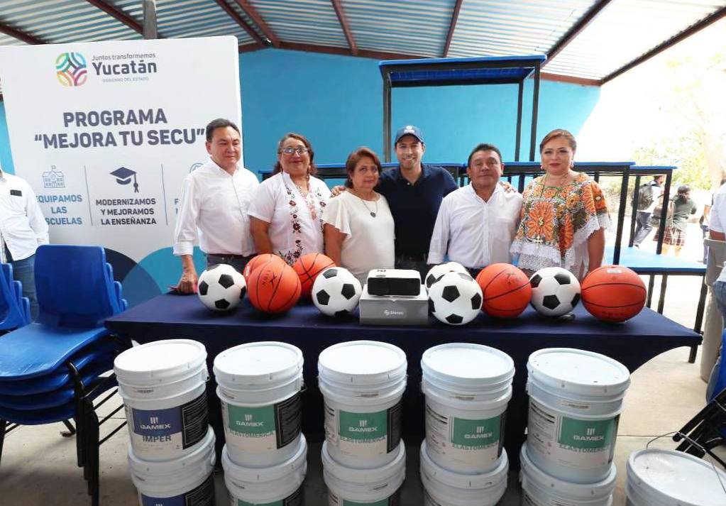 Respecto del kit de Mejora tu Secu, que recibió este colegio, incluye proyector multimedia, 2 contenedores de basura, 5 cubetas de pintura blanca de 19 litros, 3 de azul y el mismo número de impermeabilizante, 5 balones de fútbol e igual cantidad de básquetbol; hasta ese día, se ha entregado estos paquetes a 113 escuelas de todo Yucatán. El mobiliario otorgado consiste en 12 mesas y sillas, con valor superior a 44,800 pesos, que permitirá al personal mejorar su labor.